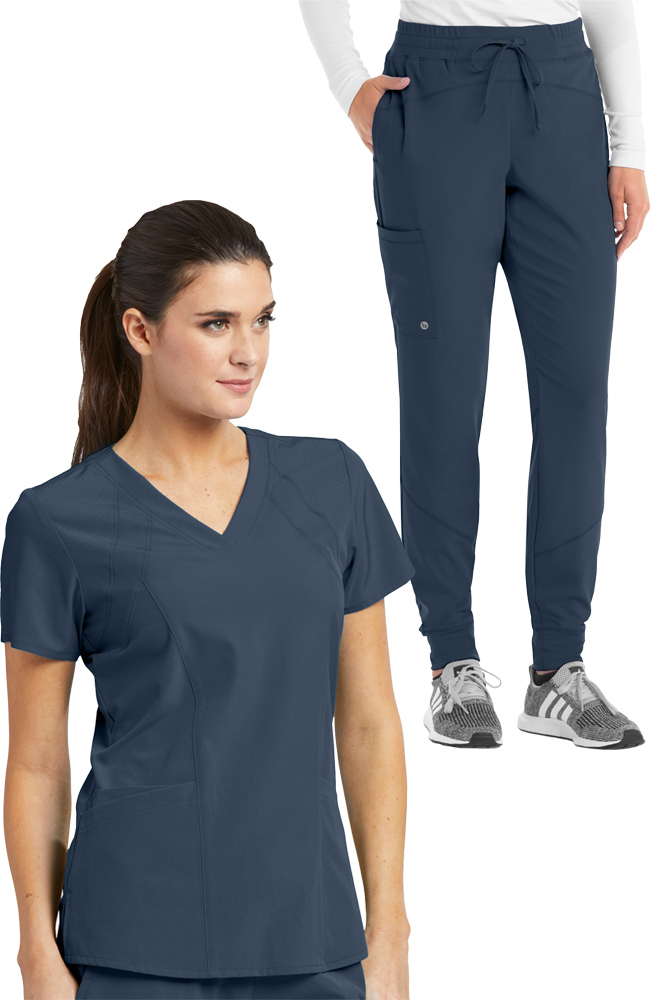 Cool perforated details add athletic-inspired style to the Barco One Women’s Racer Solid Scrub Top & Boost Jogger Scrub Pant. You’ll love the stretchy comfort and convenience of this matching scrub set.