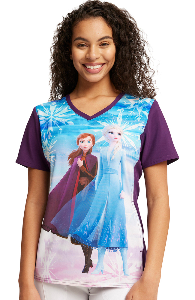 Spread warmth (and maybe a little magic) when you wear the Tooniforms by Cherokee Women’s Sisters Print Scrub Top. The dazzling Anna and Elsa print is balanced by the flattering contrast side panels and sleeves.