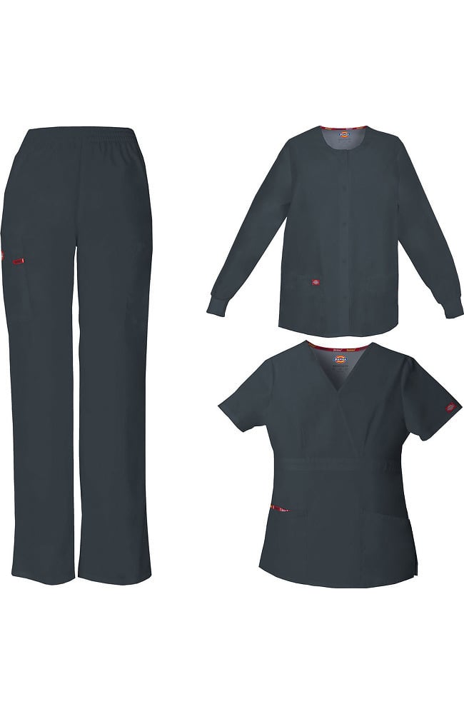 This 3-piece scrub set includes everything you need to be comfortable and look great. From EDS Signature by Dickies, this set includes a stylish mock wrap scrub top, pull on pant and round-neck warm up jacket. The top has an empire waist and patch pockets. There’s also an instrument loop on the right pocket. The natural rise pant has all-around elastic at the waistband and a tapered leg. It has front slash pockets and layered cargo pockets as well as a handy instrument loop. The snap front scrub jacket has layered patch pockets, a back yoke and knit cuffs. All 3 pieces have handy interior knit mesh pockets and instrument loops.