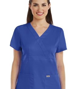 - Junior contoured fit, mock-wrap scrub top