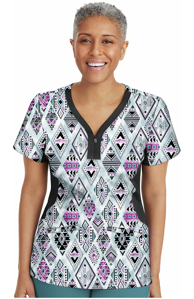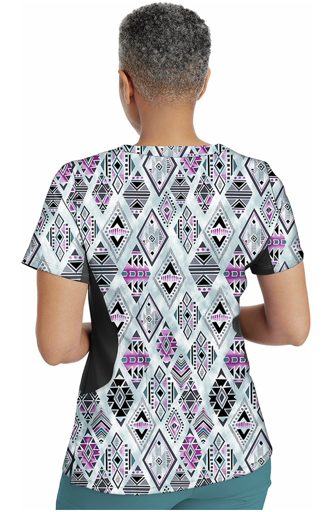 Geometric patterns bring cool boho vibes to the Purple Label by Healing Hands Women’s Jessi Y-Neck Tribal Sky Print Scrub Top. The stretchy knit side panels add extra comfort and style to this colorful top.