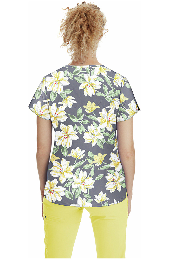 Brighten up your daily look when you wear the Purple Label by Healing Hands Women’s Isabel Sunny Azalea Print Scrub Top. Bursting with blooms, this stretchy scrub top has two front pockets, plus decorative buttons at the neckline.
