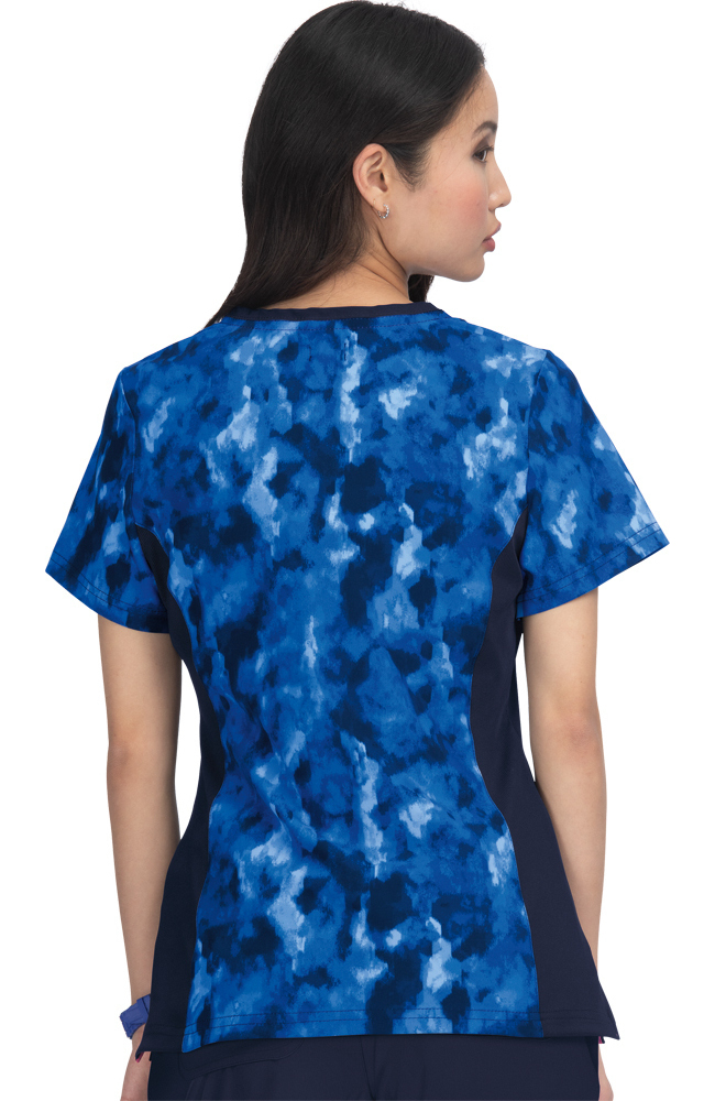 Feel calm and cool with the stunning blue shades of the koi Lite Stretch Women’s Raquel Mock Wrap Camo Visions Print Scrub Top. Stretchy ribbed side panels make this scrub top comfortable and flattering.