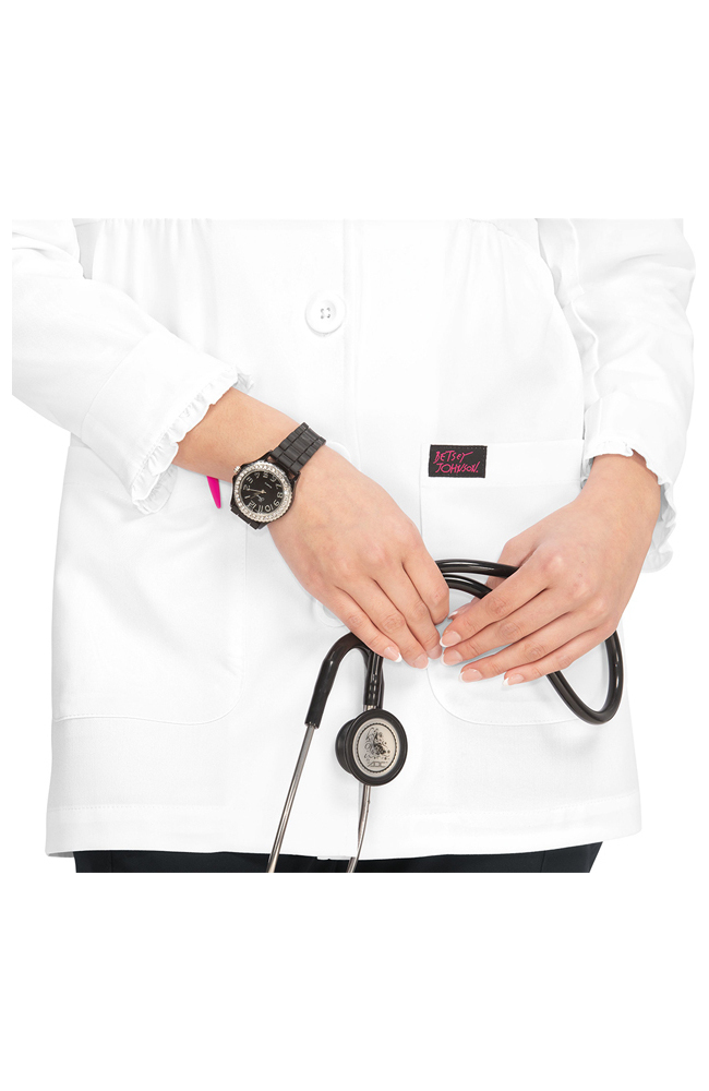Professional, but make it chic. The Betsey Johnson by koi Women’s Juniper Lab Coat gives the essential topper a fun, feminine twist with slightly puffed sleeves, ruffled cuffs and flattering gathered details.