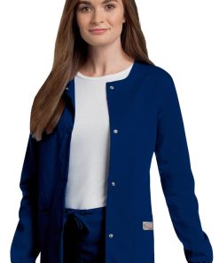 - Jewel neckline scrub jacket with four matching snap-ring closures