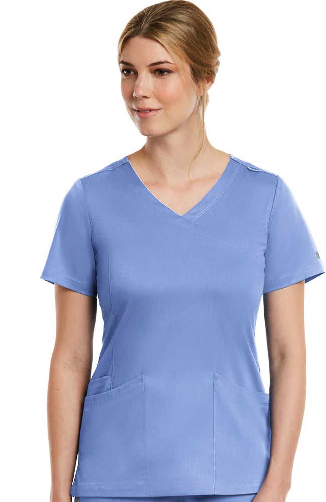 You’ll love all the utility and comfort details of this Matrix by Maevn Women’s Mock Wrap Knit Panel Solid Scrub Top. Knit back panels add easy movement and a soft touch.