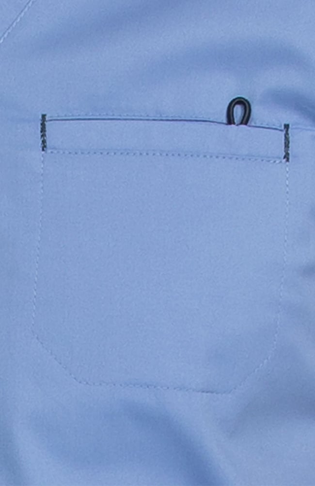 This comfortable men’s V-neck scrub top is made in E-Z Flex, a poly/cotton stretch fabric. From Med X, the 8471 is meant to be flattering with a slimmer fit. It has roomy welt pockets in the front and at the breast. The chest pocket has a badge holder.
