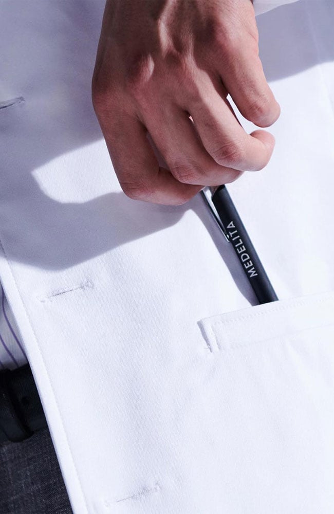 Precision tailoring takes the Medelita Men’s H W Cushing Lab Coat to new heights with improved mobility and stretch. This professional lab coat style allows you to move freely and stay organized on even the busiest of days, all while maintaining a professional, collected image.