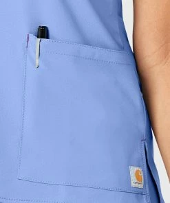 This stretch V-neck media scrub top from Carhartt looks great in gorgeous rich colors while working as hard as you. The 12110 is made of innovative Cross-Flex fabric that wicks away sweat to keep you dry, releases stains to keep you looking fresh and bright and stretches with you to keep you comfortable. It has 2 patch pockets, 1 with an interior cell phone pocket and 1 layered with a divided pocket with badge loop. There is a unique slot in the neckline to hold your earbuds and there’s a handy double pocket on the sleeve. It even has a locker loop for easy hanging and triple needle stitching to reinforce the shoulder seams.