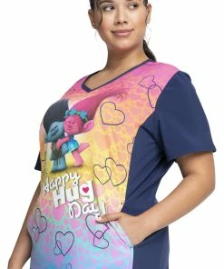 Embrace the day in the Tooniforms by Cherokee Women’s Happy Hug Day Print Scrub Top. This vibrant scrub top has a heart-filled digital print on a background of solid navy.