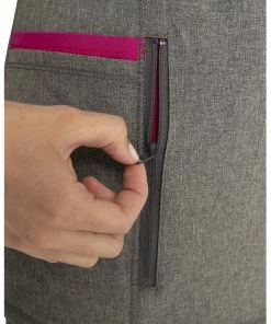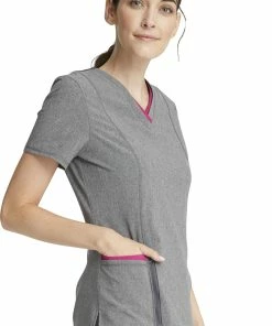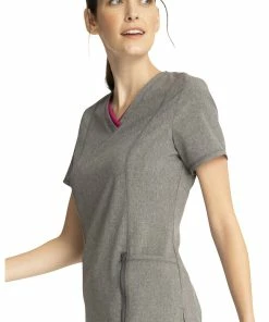 You’ll want to make room in your closet for the Infinity by Cherokee Women’s Shaped V-Neck Top. In cool, on-trend heather grey with pops of magenta and a comfy ribbed back panel, this flattering scrub top is sure to be a favorite.