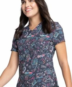 If you ever drew doodles on your notebooks (or still do), the Fashion Prints by Cherokee Women’s Tuckable Smart Stuff Print Scrub Top is the one for you! Ideal for pediatric settings, this colorful scrub top has just a single chest pocket, so it’s easy to wear tucked in.