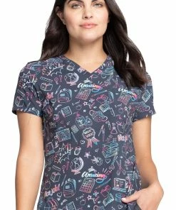 If you ever drew doodles on your notebooks (or still do), the Fashion Prints by Cherokee Women’s Tuckable Smart Stuff Print Scrub Top is the one for you! Ideal for pediatric settings, this colorful scrub top has just a single chest pocket, so it’s easy to wear tucked in.