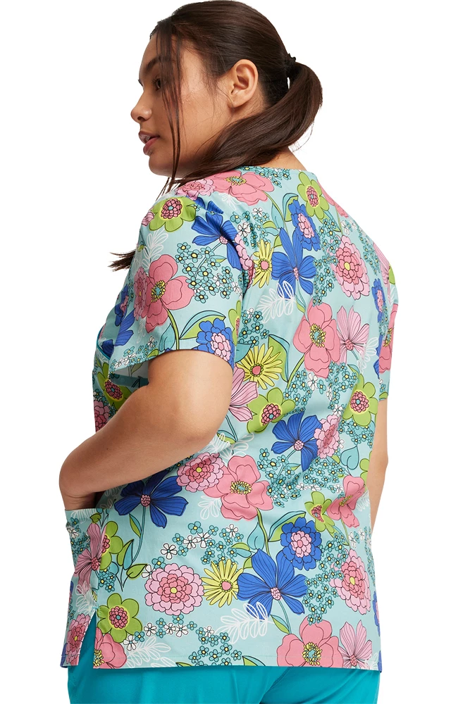 The Fashion Prints by Cherokee Women’s Mock Wrap Retro Buds Print Scrub Top features a vintage-inspired print that adds groovy style to your everyday uniform. Made from soft, breathable cotton with stretch for all-day comfort, this mock wrap scrub top works just as great as it looks.