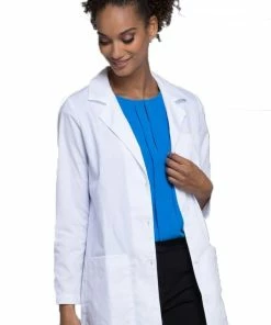 This longer length women’s lab coat has a notched collar and three-button front. It features 5 pockets: chest pocket, 2 patch pockets, beeper pocket and interior cell phone pocket. This scrub top is made of soil-release poly/cotton twill.