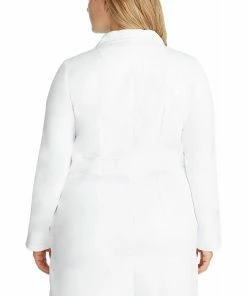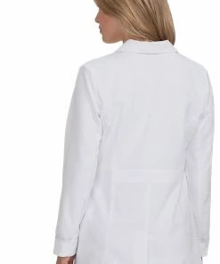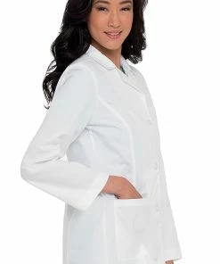 This longer length women’s lab coat has a notched collar and three-button front. It features 5 pockets: chest pocket, 2 patch pockets, beeper pocket and interior cell phone pocket. This scrub top is made of soil-release poly/cotton twill.
