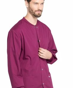 Add a functional layer over your uniform with this Professionals by Cherokee Workwear Men’s Snap Front Warm-Up Solid Scrub Jacket. Knit cuffs and neckline emphasize comfort all day.