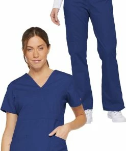 This scrub set from EDS Signature by Dickies includes a stylish mock wrap scrub top and drawstring pant. The top has an empire waist and patch pockets. There’s also an instrument loop on the right pocket and a stretchy knit interior pocket. The pant has a mid rise and flare leg. The adjustable drawstring and back elastic waistband allows you to find your perfect fit. There are scoop pockets at the waist, layered patch cargo pockets with a stretchy knit interior pocket and a back patch pocket.