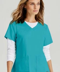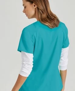 Find your happy place with the breathable, easy-fitting Spandex Stretch by Grey’s Anatomy Women’s V-Neck Solid Scrub Top. The curved shirttail hemline makes this scrub top look great tucked in or out, along with the symmetrical mirrored front pocket design.