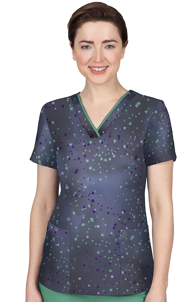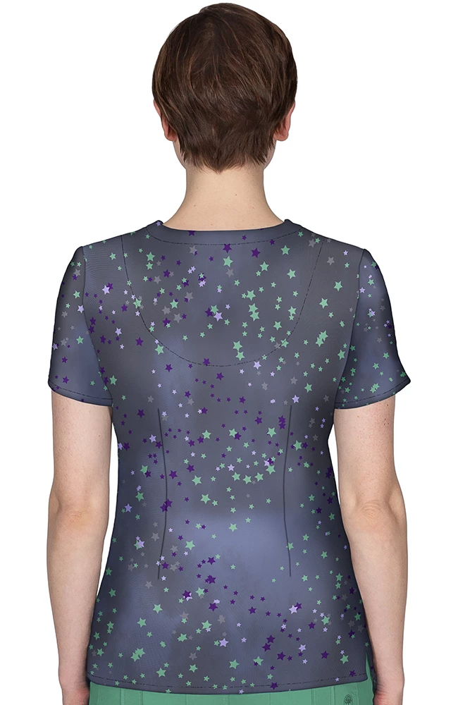 The Premiere by Healing Hands Women’s Amanda Stary Sky Print Scrub Top features stunning purple and green stars on a grey backdrop. This beautiful print is perfect for outer space or astrology fans.