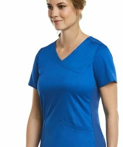 You’ll love all the utility and comfort details of this Matrix by Maevn Women’s Mock Wrap Knit Panel Solid Scrub Top. Knit back panels add easy movement and a soft touch.