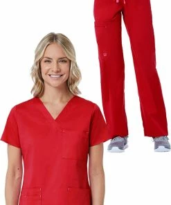 This playful scrub set comes from the Blossom collection by Maevn and starts with a V-neck scrub top with plenty of pockets. Contrast bartacking adds a trendy touch. There are two front patch pockets, an additional divided pocket, breast pocket and a hidden, three-part accessory loop. This fashion scrub top is triple stitched for durability and you’ll never see puckering on any of the seams. The cargo scrubs are boot cut with a comfortable elastic waist with a front drawstring for perfect fit. They were designed to handle the wear and tear of an active work environment with triple stitching at the side seams and pockets and contrast bartacking at all pressure points. The two front patch pockets have attached utility pockets. The cargo pocket on the right leg has an inner smart phone pocket that keeps your mobile device in easy reach. This scrub set is made from a cotton / poly / spandex fabric blend that is brushed on both sides for softness and comfort.