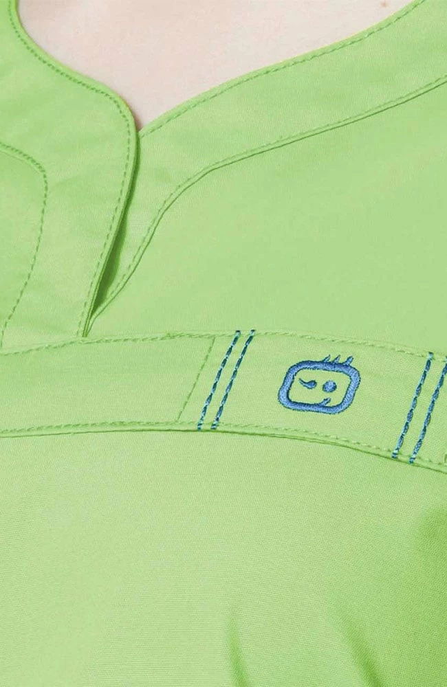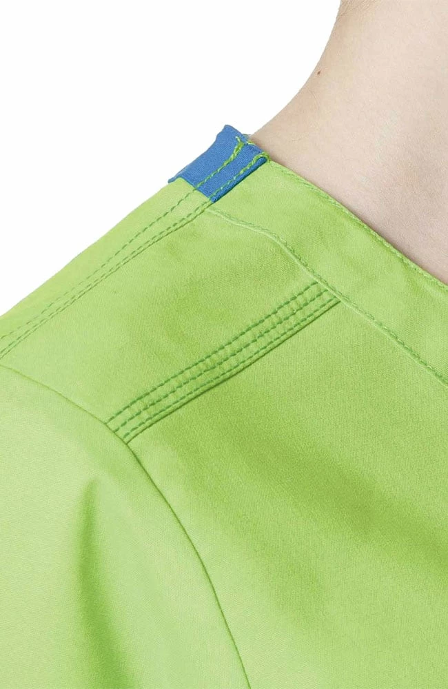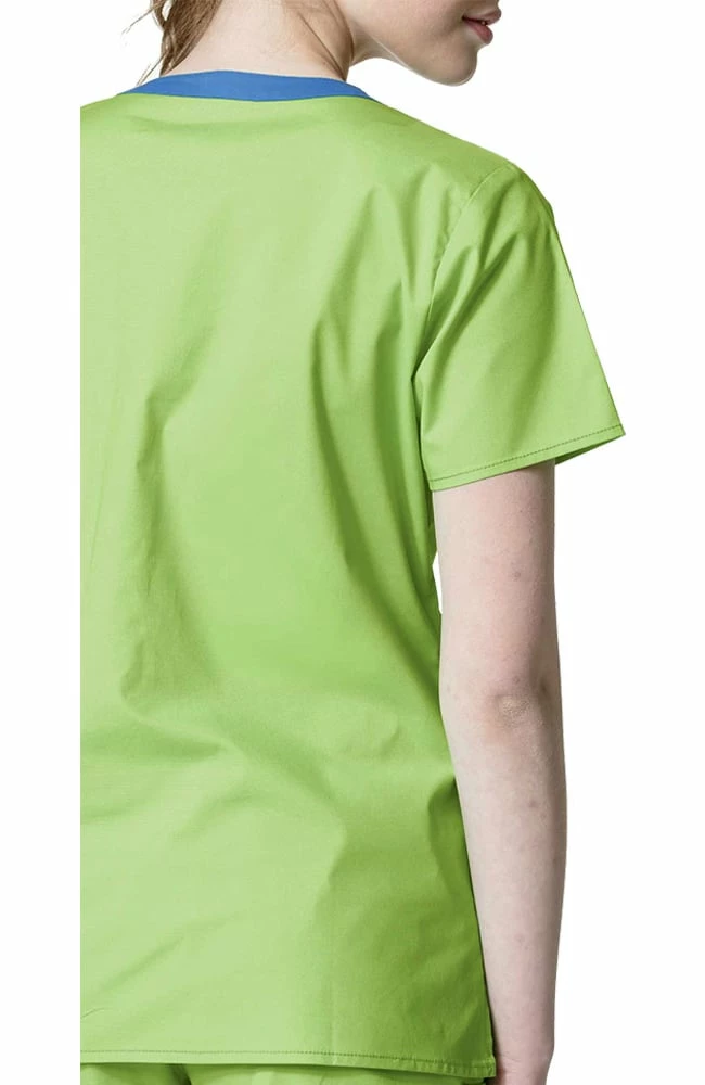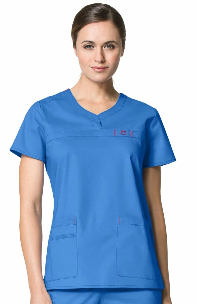This curved, notch-neck scrub top has a banded front yoke and curved shaped neck facing that keeps the neckline loose but still modest. This top also has banding at the top yoke. It has a dropped shoulder with reinforced stitching. There are 2 front patch pockets, 1 is a signature WonderWink triple pocket. WonderFLEX is a cotton-rich, premium fabric. It has enough give to be supremely comfortable while maintaining its shape for a polished look.