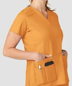 The “Verity” is a comfortable V-neck scrub top in premium quality stretch fabric. It will move with you and flatter your shape. This is accentuated by the 2 front darts. The 2 front patch pockets are slightly angled and the right pocket is layered with a second, divided pocket. There’s a dropped shoulder reinforced with triple-needle stitching. Contrast fabric at the back neck facing creates a flush seamline that lies flat. WonderFLEX is a cotton-rich, premium fabric. It has enough give to be supremely comfortable while maintaining its shape for a polished look.