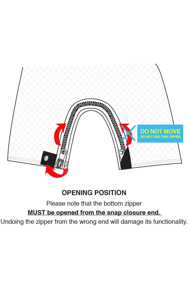 - Note: bottom zipper must be opened from the snap closure end