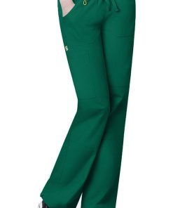 These scrub pants are mid-rise with an easy fashion fit and utilitarian details. They have easy elastic and a dyed-to-match drawstring at the waist, plus belt loops. There are on-trend double-stitched knee and side seams. There are two scoop patch pockets at the front, one with an interior cell-phone pocket, and rectangular patch pockets at the back. There is an additional cargo pocket on the right leg. The fabric is a poly/cotton blend.