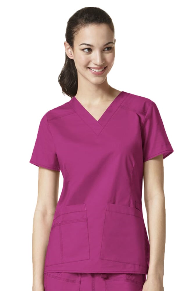 The “Verity” is a comfortable V-neck scrub top in premium quality stretch fabric. It will move with you and flatter your shape. This is accentuated by the 2 front darts. The 2 front patch pockets are slightly angled and the right pocket is layered with a second, divided pocket. There’s a dropped shoulder reinforced with triple-needle stitching. Contrast fabric at the back neck facing creates a flush seamline that lies flat. WonderFLEX is a cotton-rich, premium fabric. It has enough give to be supremely comfortable while maintaining its shape for a polished look.