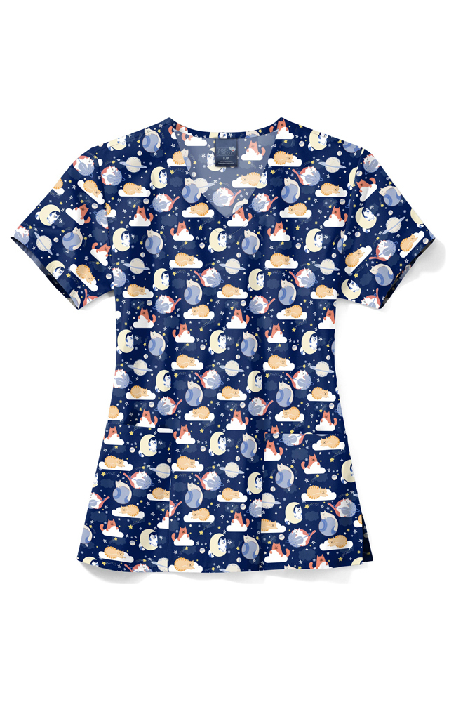 The Zoe and Chloe Women’s V-Neck Moon Meow Print Scrub Top is playful, practical, and performance driven. Made from soft, stretchy fabrics, this scrub top looks great and works as hard as you do.